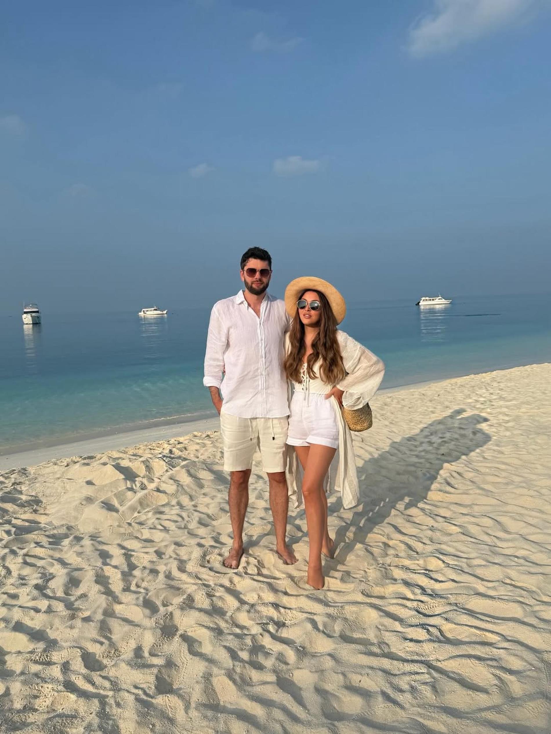 Избранник Дубцовой позировал в белой рубашке, шортах и темно-коричневых солнцезащитных очках. Пара стояла в обнимку на песке на фоне океана с яхтами.