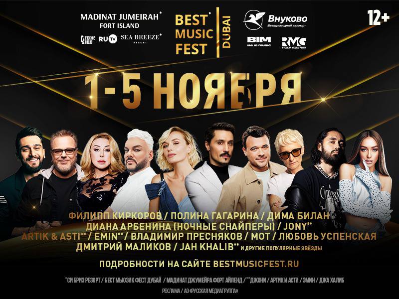 1 ноября в Дубае стартует масштабный музыкальный фестиваль Best Music Fest, который для гостей и экспатов одного из самых дорогих курортов Арабских Эмиратов проведет «Русская Медиагруппа» совместно с BIM Group. Пять дней, наполненных самыми яркими российскими хитами в исполнении артистов, имена которых знают не только в России, но и за ее пределами. С 1 по 5 ноября каждый вечер будут проходить захватывающие музыкальные шоу звезд российской эстрады, несопоставимые по масштабу и зрелищности ни с одним другим фестивалем.