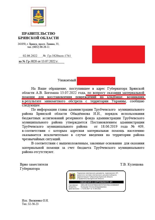 «А ведь ранее её руководитель — губернатор Богомаз заявлял, что, например, компенсации за имущество, повреждённое при обстреле ВСУ 14.04.2022 г. другого приграничного посёлка Климово, будут выплачены. Получается, что для Кулешовой слова губернатора Богомаза мало что значат?» — вопрошает Павлов.