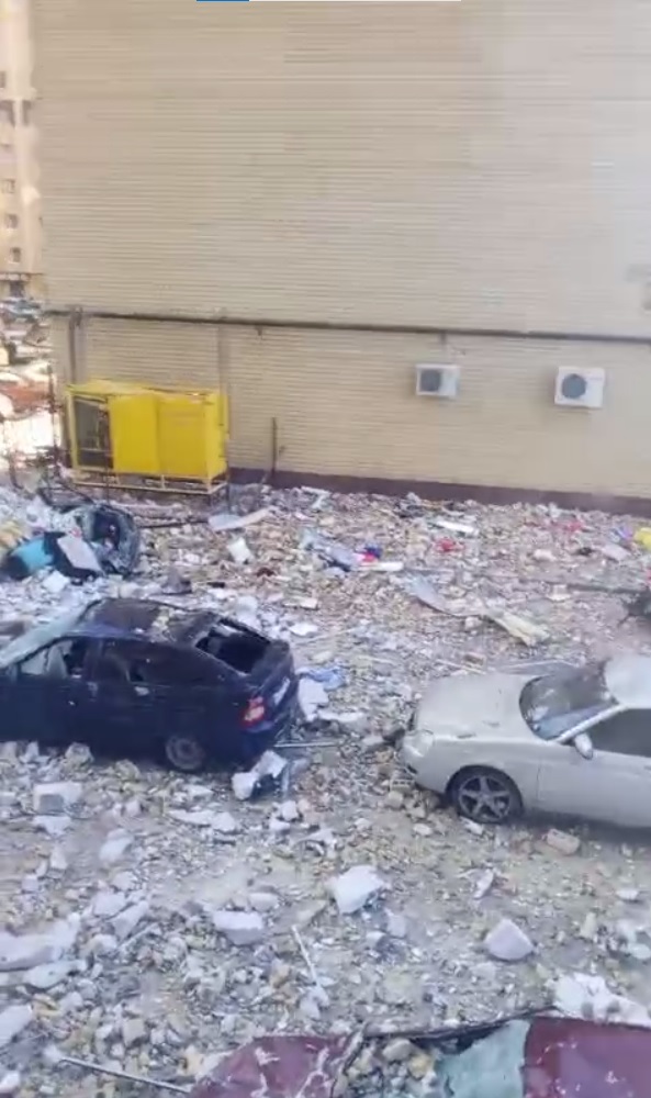 Позднее очевидцы начали выкладывать в Сеть кадры с последствиями разрушений. Сообщается, что прилегающий к дому двор завалило фрагментами кладки, многие автомобили получили значительный ущерб.