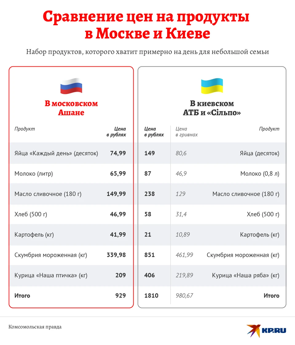Журналисты также сравнили стоимость продуктовой корзины из московского «Ашана» и киевской сети АТБ. Оказалось, что яйца, молоко, масло, рыба в украинской столице стоят дороже, дешевле обходится лишь картошка. В целом стоимость набора питания различается в два раза.