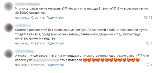 Комментируя новость в Сети, петербуржцы указали на небольшие размеры штрафов, отметив, что чиновники куда большие суммы оставляют в ресторанах. Жители Северной столицы призывают отстранять чиновников от должности за «отписки», либо увольнять с запретом занимать руководящие должности пожизненно.